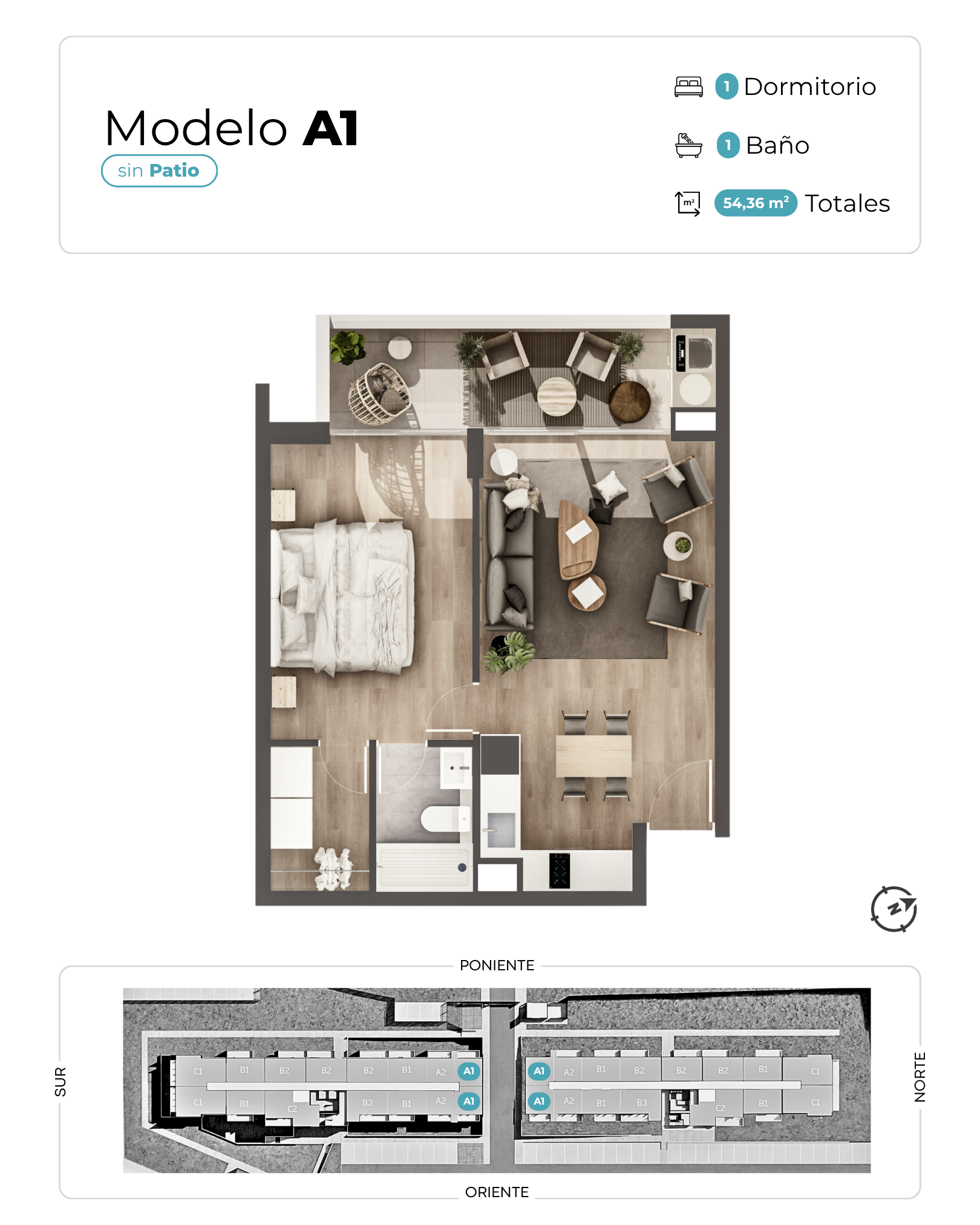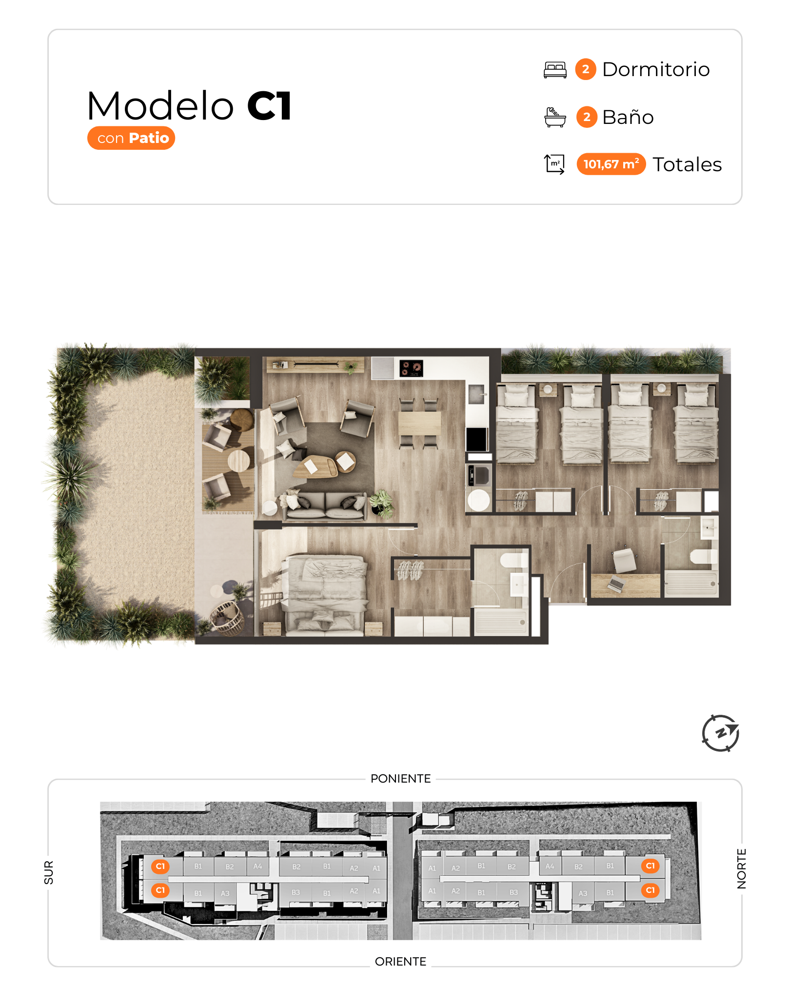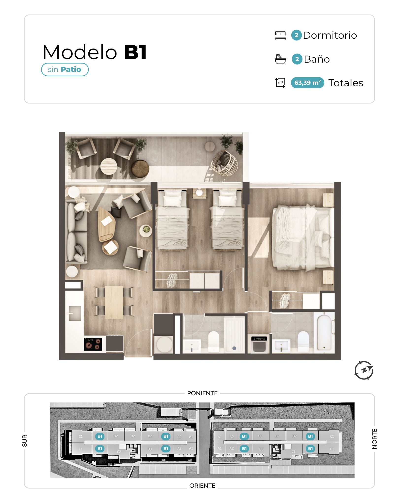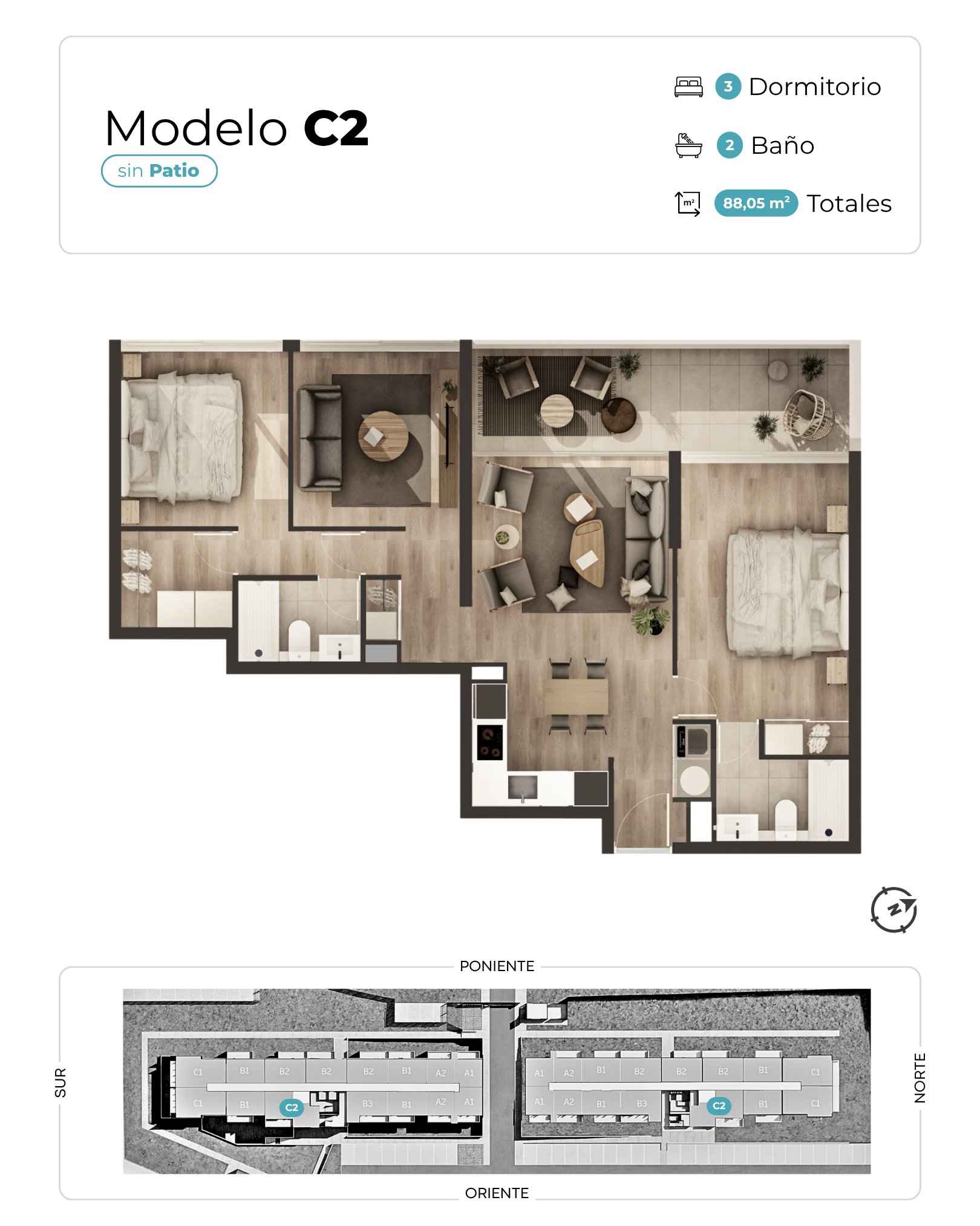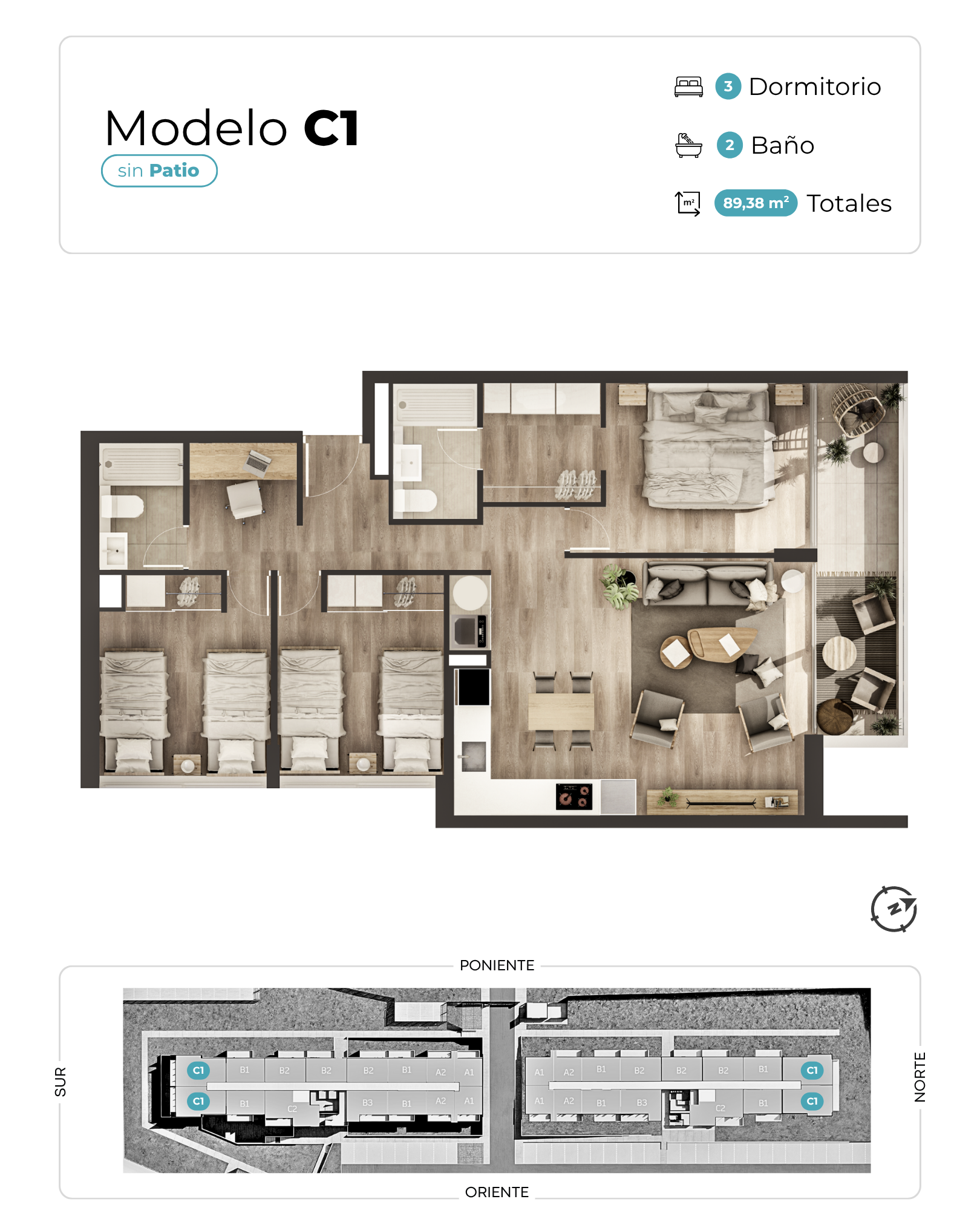 • Cocina amoblada y equipada tipología A con horno, encimera y campana tipologías B y C1 con horno, microondas, encimera y campana. (Tipologías C2 no cuenta con microondas)